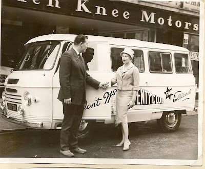 *Another method of transport was the “Top Twenty” Commer Van, advertised beautifully here by the glamorous Stephanie Austin, a compere at the Trowbridge Town Hall. There were apparently 3 or 4 of these 10-seater vans used over a period of time, all custom made by the curiously named Hebdon Knee garage. With Stephanie in the above photo is the Hebdon Knee owner, John Knee.